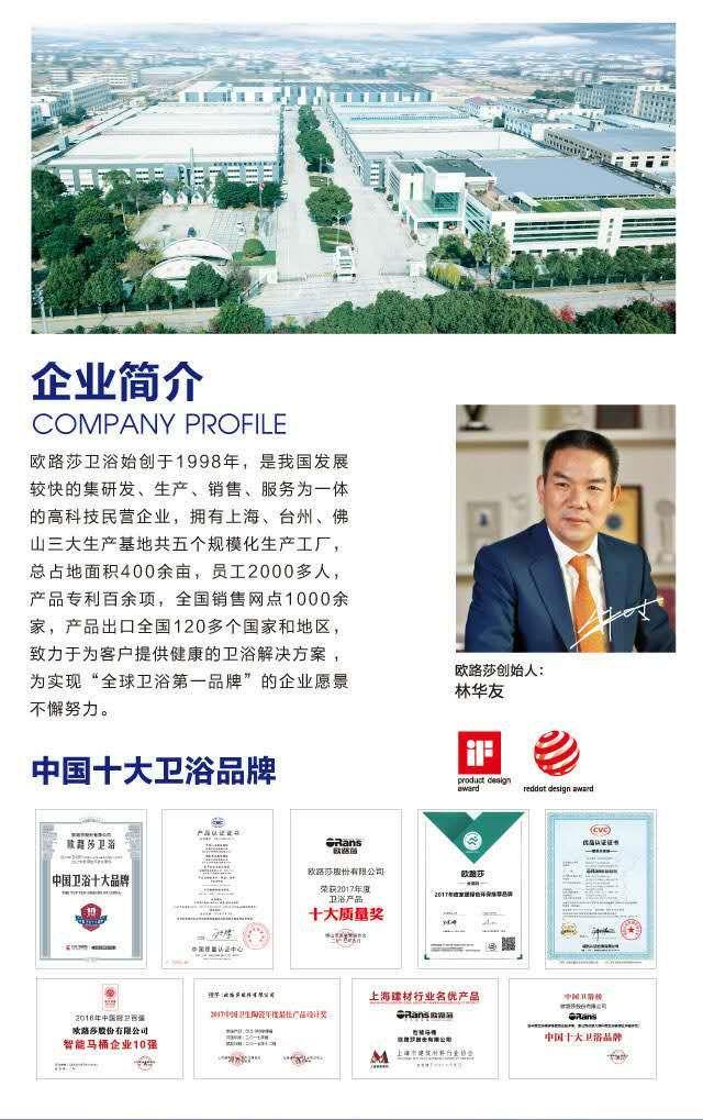 欧路莎卫浴创始于1998年,是我国发展较快的集研究、生产、销售、服务为一体的高科技民营企业。拥有五大规模化、现代化的生产工厂,产品专利百余项,欧路莎一直致力于为客户提供健康的卫浴解决方案,为实现“全球卫浴第一品牌”的企业愿景不懈努力。