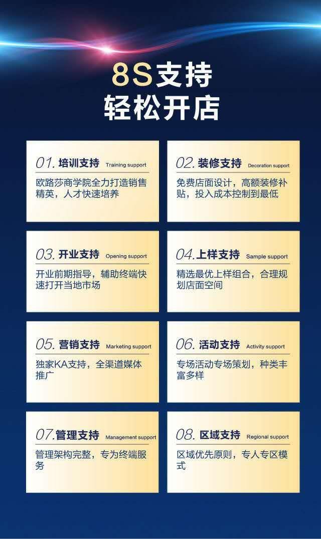 对于新加盟的客户,欧路莎卫浴将从店面装修支持,开业支持,推广支持,运营支持,培训支持,新商帮扶打造等方面进行全线帮扶,相信不久的未来,欧路莎卫浴将与经销商携手共创十亿宏伟大业。