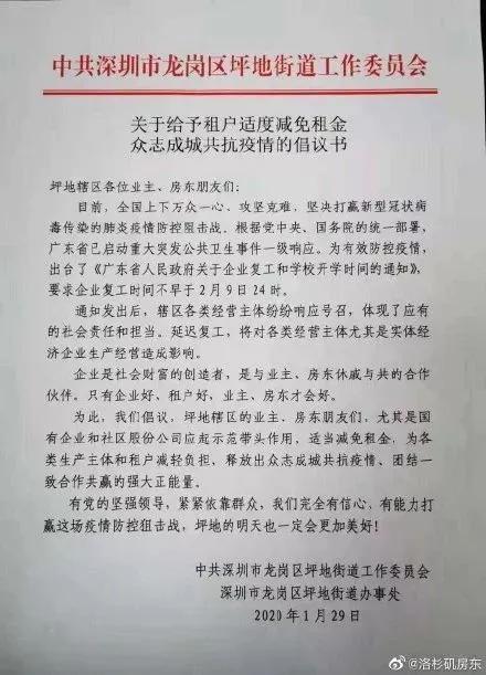 深圳龙岗倡议书:1月30日,布吉街道向辖区业主、房东发出《关于适度减免租金戮力同心共克时艰的倡议书》,信义地产、信和商业、深圳市稼贾福实业有限公司等积极响应。
