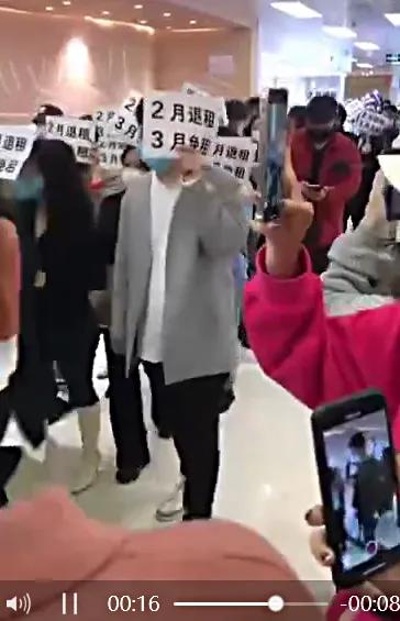 3月5日,一段新中国大厦服装城商户要求免租的视频在社交平台上流传。该视频显示,一批商户面带口罩,举着“2月退租、3月免租”的纸张在商场里行走,并有围观群众拍照。