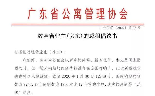 广东省公寓管理协会倡议:建议2020年2月 1日-2月29日(影响最大最直接的2月份)免租一个月,3月1日-4月30日租金减半两个月。