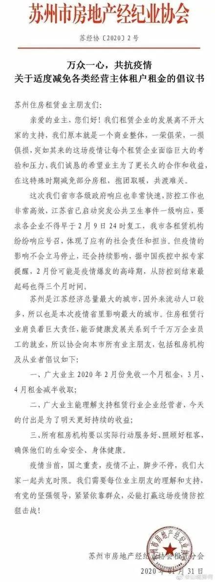 苏州房地产经纪协会倡议:望房东在疫情影响最直接最大的2月份(即2020年2月)能免租一个月,3月1日-4月30日租金减半两个月,疫情无情人有情。