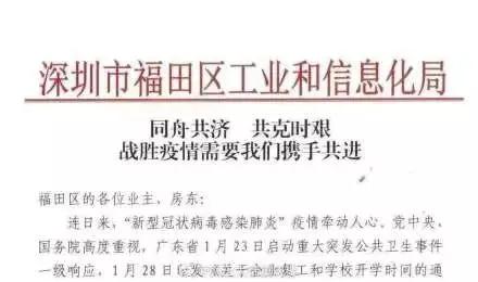 深圳福田倡议书:福田区的产业园区、写字楼业主、物业管理方及经营者一起行动起来,为延迟复工的企业和租户减免租金、减免物业管理和其他费用,减轻延迟复工企业的负担,携手企业共克时艰。