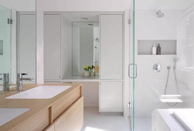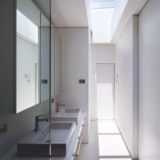 在浴室的设计中,设计师大胆使用了大面积天窗,提升空间通透度,并带来充足的自然光照明,此外还有德立菲Vero洗脸盆的简约设计,恰到好处的融入空间设计,成为不可忽视的点睛之笔。