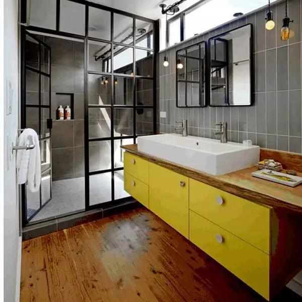 在透明隔断的浴室里,德立菲Duravit设计的Vero双人洗脸盆,为主人的日常使用提供了大量的实用空间,与色彩鲜艳的台盆柜也十分搭调。