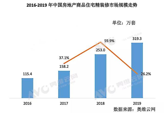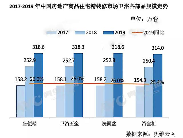 2019年,精装修市场整体规模319.3万套,同比增长26.2%。其中,精装修卫浴市场规模319万套,卫浴部品作为精装房一级配套部品,在大环境影响下,增势平稳。
