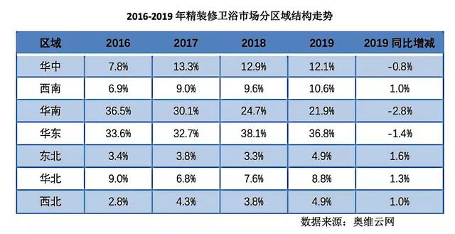 2019年数据显示,精装修卫浴市场仍以华东和华南地区为主,占据市场份额近60%。与往年相比,2019年以来,精装卫浴市场开始向西部、北部地区扩张。