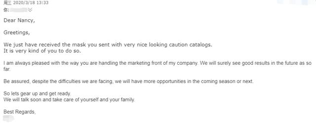 收到东鹏寄出的口罩后,海内外的客户纷纷表达了对东鹏的感谢之情。