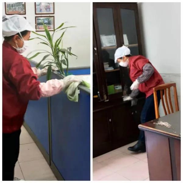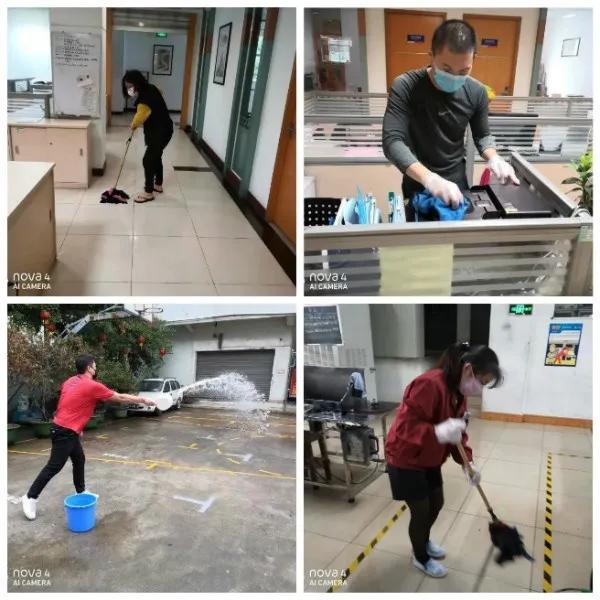 2020年2月10日,防疫组长崔永雄、何和祖带领刘小冰、魏功兰、刘兴宏、余佩蓉、刘永花、于先群等人对公司办公室、生产车间、餐厅、员工宿舍、广场等进行全面清扫、消毒,对进出厂区人员建立健康监测方案等。