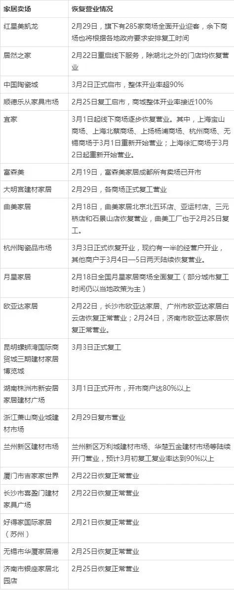 多地家居卖场陆续复工复市,其中不少卖场开业率达80%以上:
