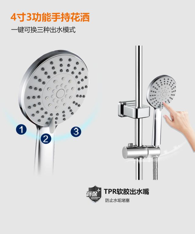 具有一键可换三种出水模式,满足你不同的淋浴需求;采用环保材料制成良好触感出水嘴,轻按软胶,污垢轻易排出,干净卫生,不容易滋生细菌,如家人般全方位呵护。
