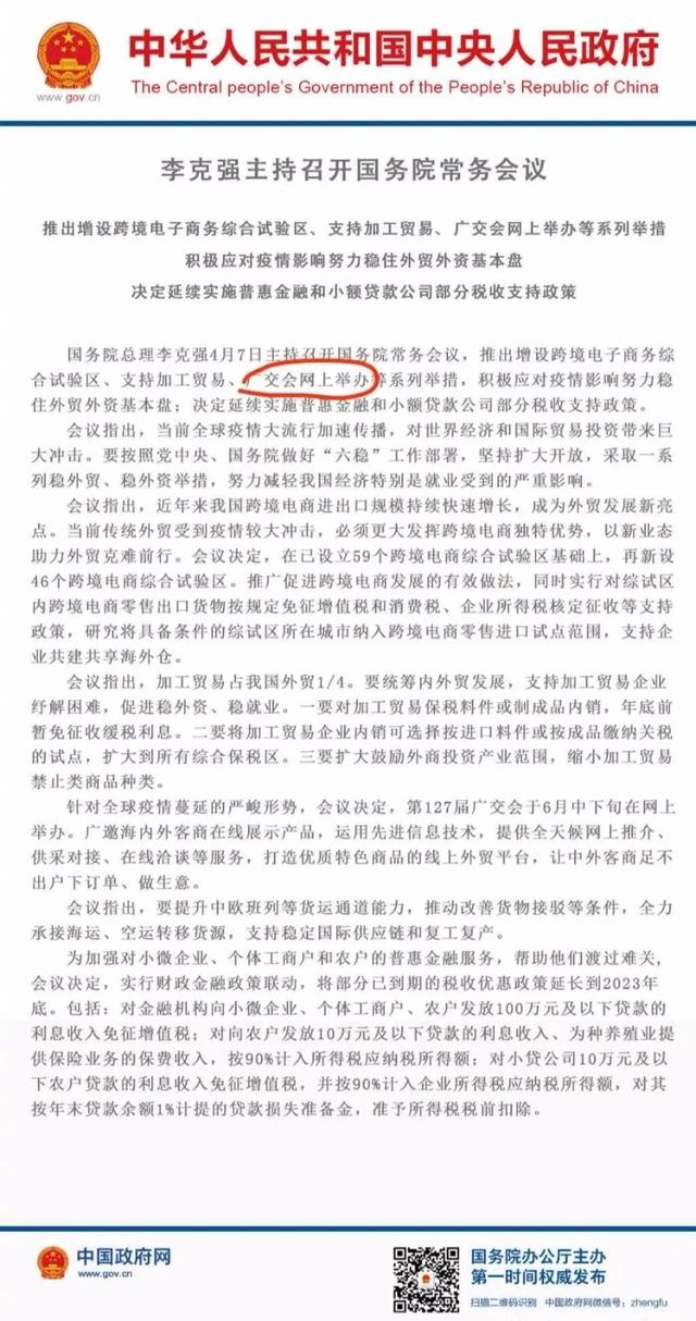 针对全球疫情严峻形势,会议决定,第127届广交会于6月中下旬在网上举办。这将是中国历史最为悠久的贸易盛会首次完全以网络形式举办,广邀海内外客商在线展示产品,运用先进信息技术,提供全天候网上推介、供采对接、在线洽谈等服务,打造优质特色商品线上外贸平台,让中外客商足不出户下订单、做生意。