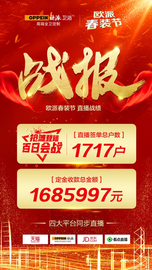 直播期间欧派以最棒的福利回馈,给消费者想象不到的优惠。直播期间狂撒现金红包,现场不断有消费者朋友秒杀抢到单品、成功预付定金,掀起了直播现场的阵阵高潮,让直播间一度失控,抢购异常火爆。