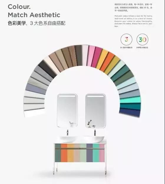 全新升级的3大色系30种色彩更是可以任意搭配定制,满足用户对卫浴空间的所有想象。