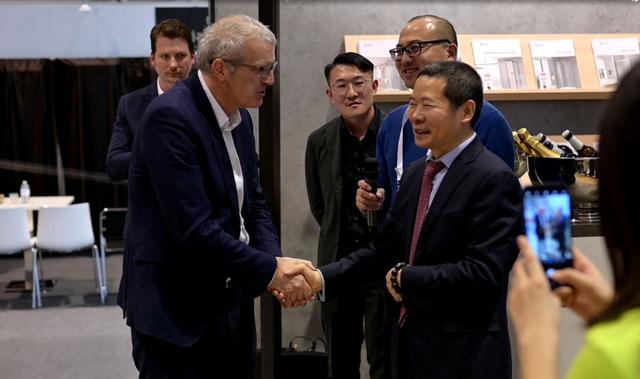 2019年法兰克福展会上,圣戈班总裁采购总裁布里斯亲临理想展位与危五祥董事长交流