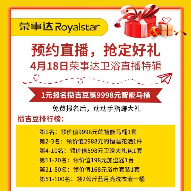 步步高升:1元报名攒吉豆赢9998元智能马桶