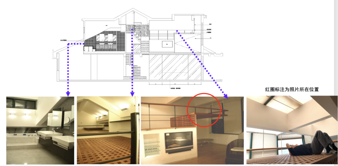 卧室旁是一个零采光小洗手间,因此他在上面做出来一个斜天窗,把卧室的光线引入浴室中。