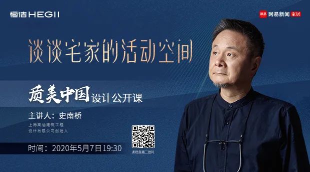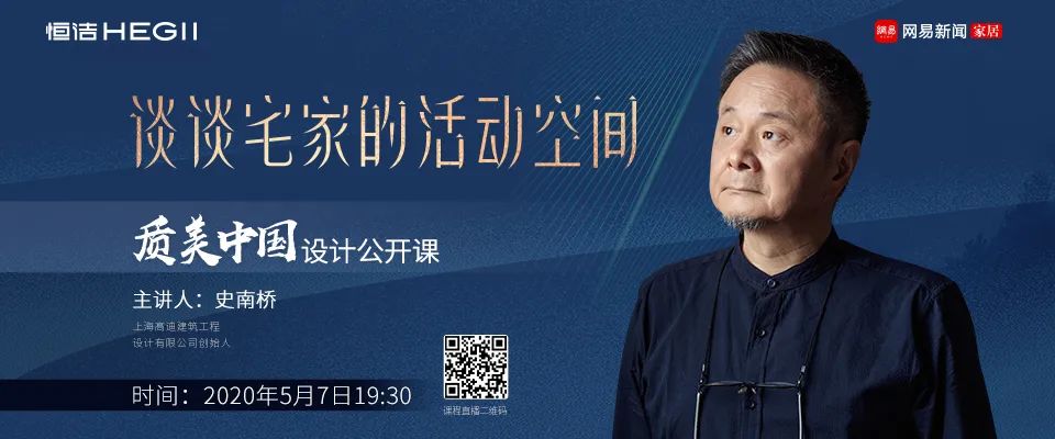 5月7日,在由恒洁×网易家居联袂发起的2020「质美中国」设计公开课第五期中,史南桥通过直播首秀形式,讲述他在疫情之间对于“家”新的感悟,并分享17年前在上海建成的家,从生活、工作、休闲、健康、游戏五个方面进行解读。
