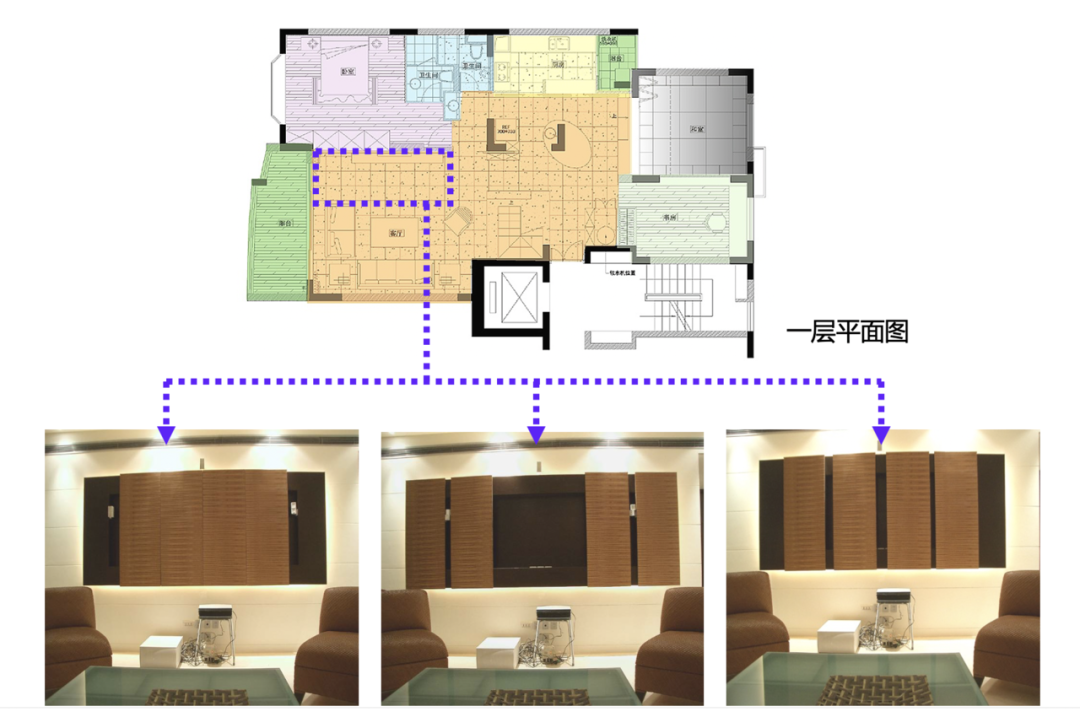电视机也做了隐藏式处理,让空间视觉可以更为多变。