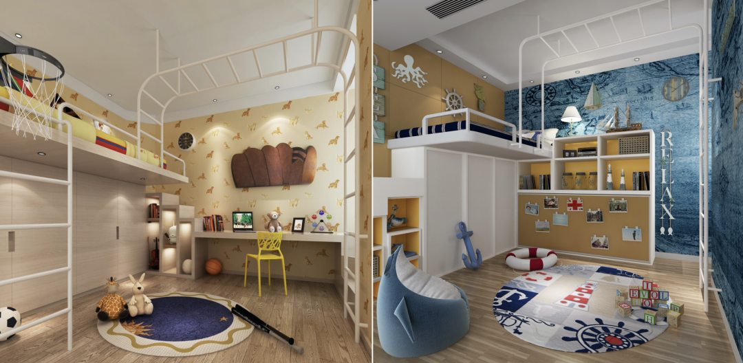 因此小孩房间也可以做成一个游戏空间,除了满足睡觉、写作业、衣物、玩具收纳的基本功能外,还可以融入攀爬,小朋友喜欢上上下下探索空间,同时也能达到健身的目的。