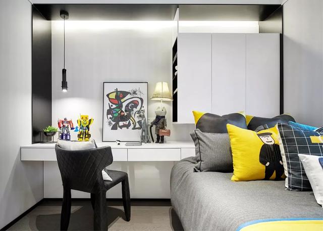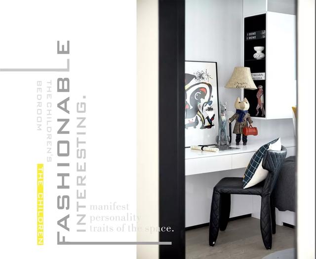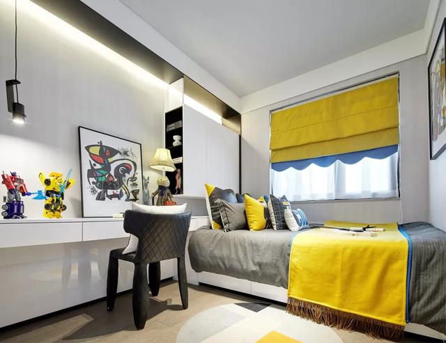 儿童房同样时尚而富有趣味性。明黄的的布艺细节活跃了空间气质。抽象夸张的艺术挂画,可爱俏皮的狐狸灯饰,个性时尚的吉他乐卷...彰显空间的性格特质。