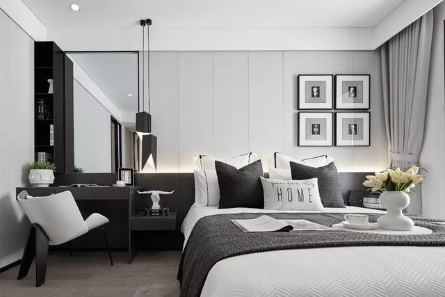 主卧延续纯粹的黑白调性,融合个性与艺术的家具,床品,配饰,在空间内表达对生活的的感受,触感自然舒适的床品,展露休憩空间应有的安逸。