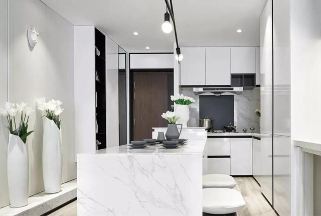 开放式岛台餐桌以白色大理石为基调,在光线的调和下呈现出通透明亮的气质。为了避免视线遮挡,我们用矮凳代替靠背餐椅,让观者的视野在进门时便穿透整个区域。