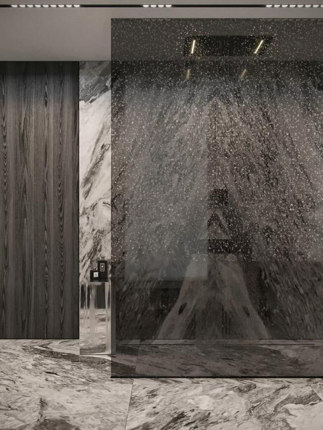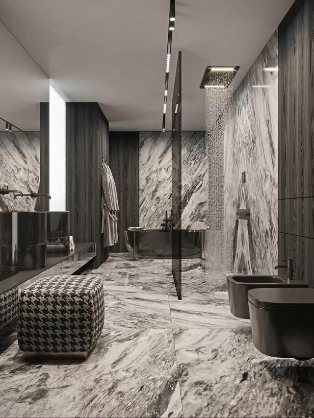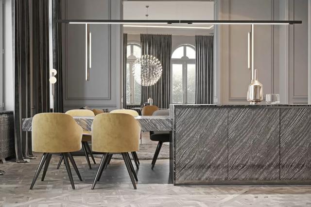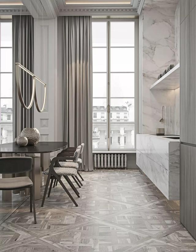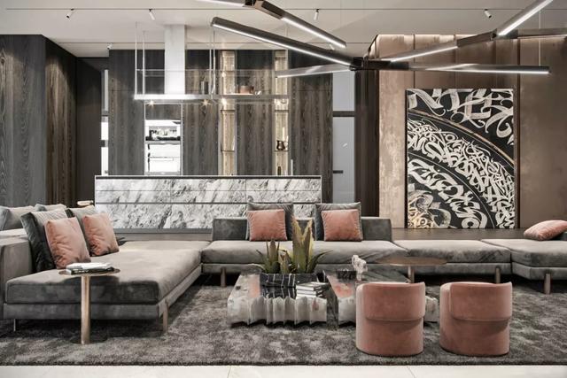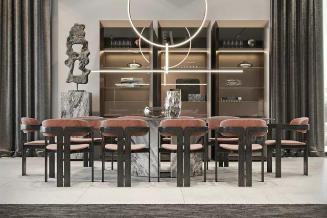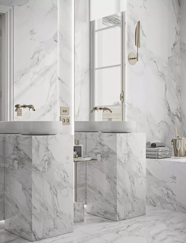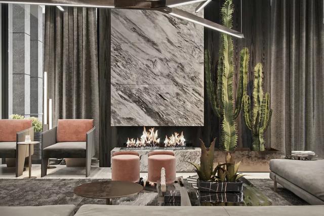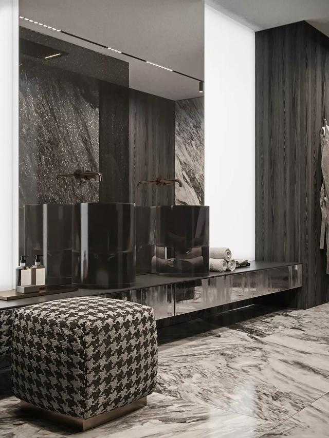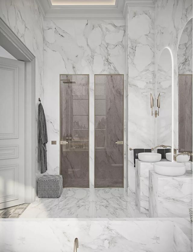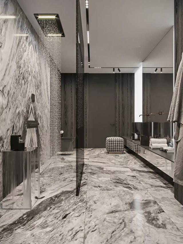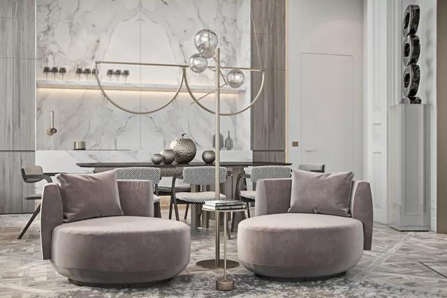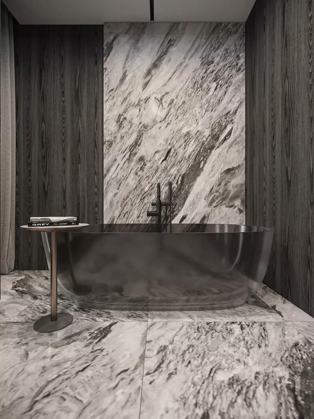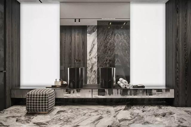 整体色调以低饱和色调为主,在采用天然大理石的搭配上,不会显得沉闷,反而能够给人一种低调的奢华。
