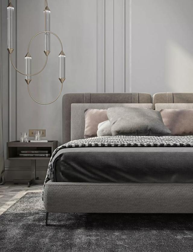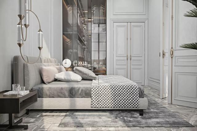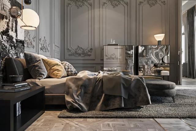 卧室墙面的欧式线条的繁琐与极简的现代装饰相碰撞,极简中透漏出低奢的华丽质感。