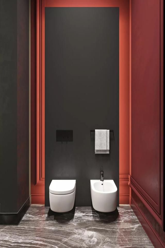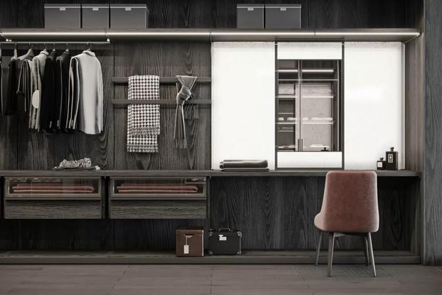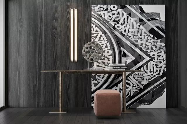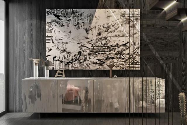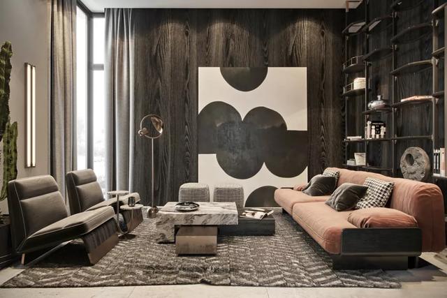 高级深灰色系遇上橙色系的浪漫,用古典美学的浪漫加之现代艺术的精简,从而使整个空间呈现出独一无二的艺术美感。大面积的深色木质装饰墙面,给人一种莫名的深沉而安定的浪漫。
