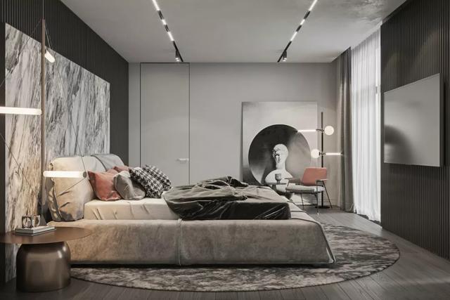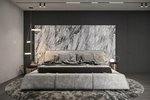 主卧室以天然大理石材质作为立面表达,木材的中性色调与灰色布艺相应和,搭配彩色抱枕与单椅,安逸而舒适地铺陈,整个空间不只是视觉上的素雅轻奢,更有着触觉上的细腻柔和与自然舒适。