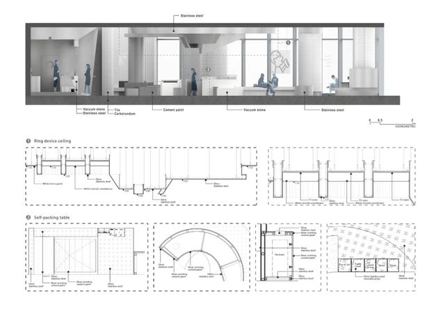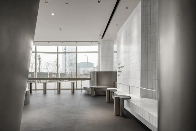 主要用材:喷砂不锈钢、耐磨水泥漆、人造石、白色条形瓷砖、U型钢化磨砂玻璃