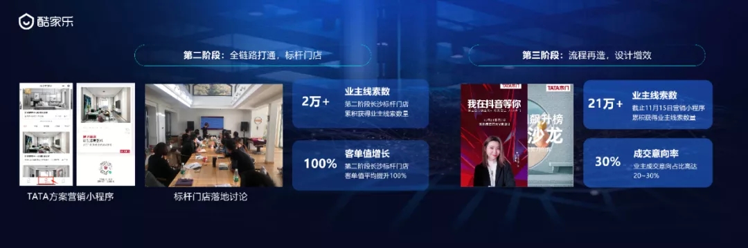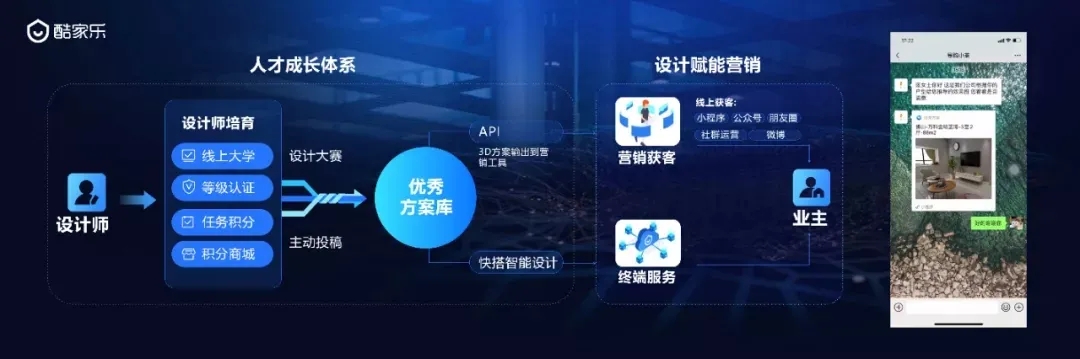 通过酷家乐平台,企业不仅可以一键下单生产,并进行跟踪管理,还可以对接企业商城,利用全景方案广告、社媒多渠道触达、全景云货架、赢客小程序等营销工具拓客引流,助力企业提升销售业绩。