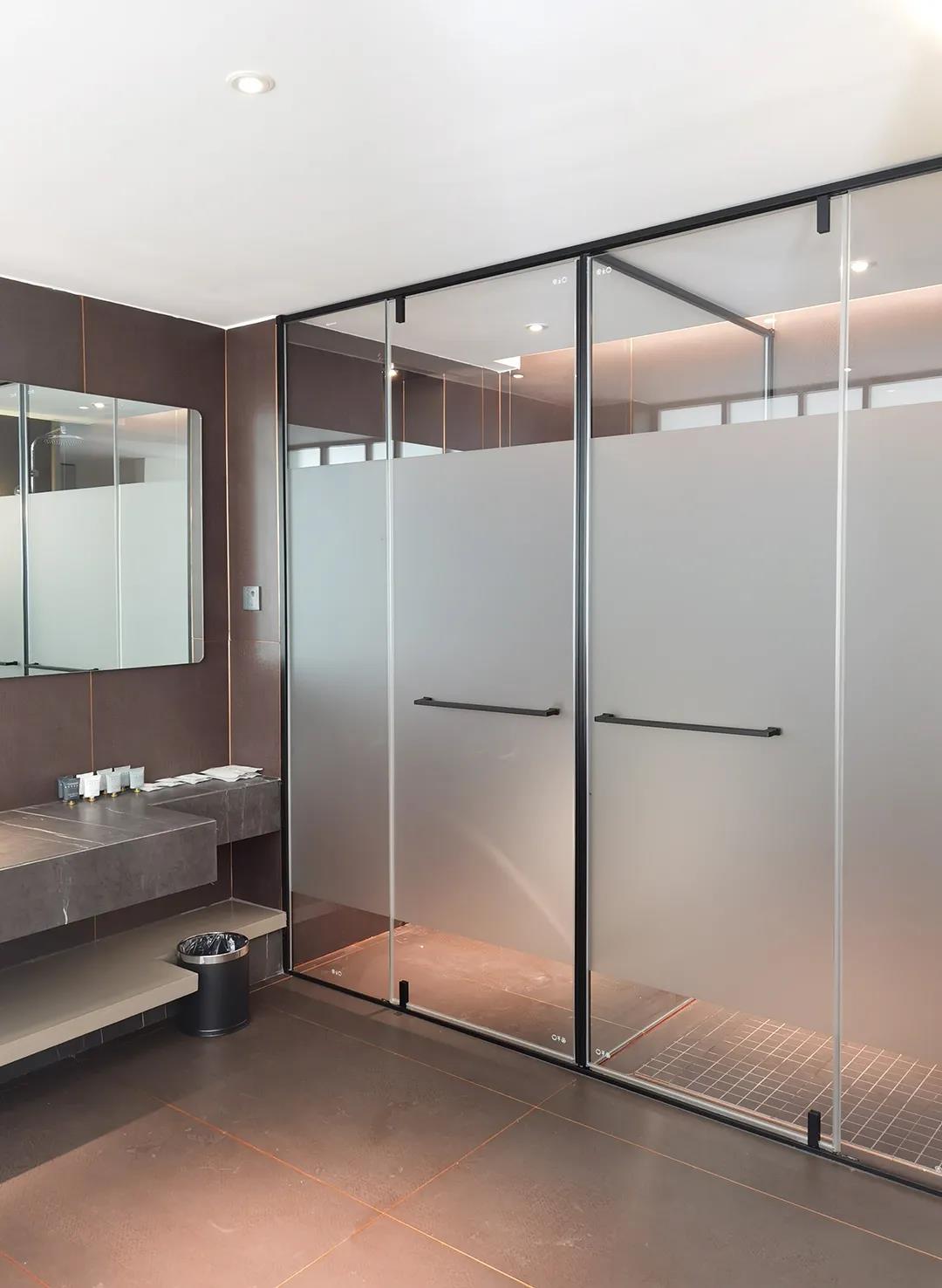 在整个酒店淋浴房的设计中还有一大亮点,就是在淋浴房玻璃的设计上,玻璃表面采用柔光工艺,使得玻璃表面只有透光性而不能透视,这样就可以使室内光线柔和而不刺眼,还能够从一定程度上更好的保护用户的个人隐私,从而达到美观性与实用性的双重效果。