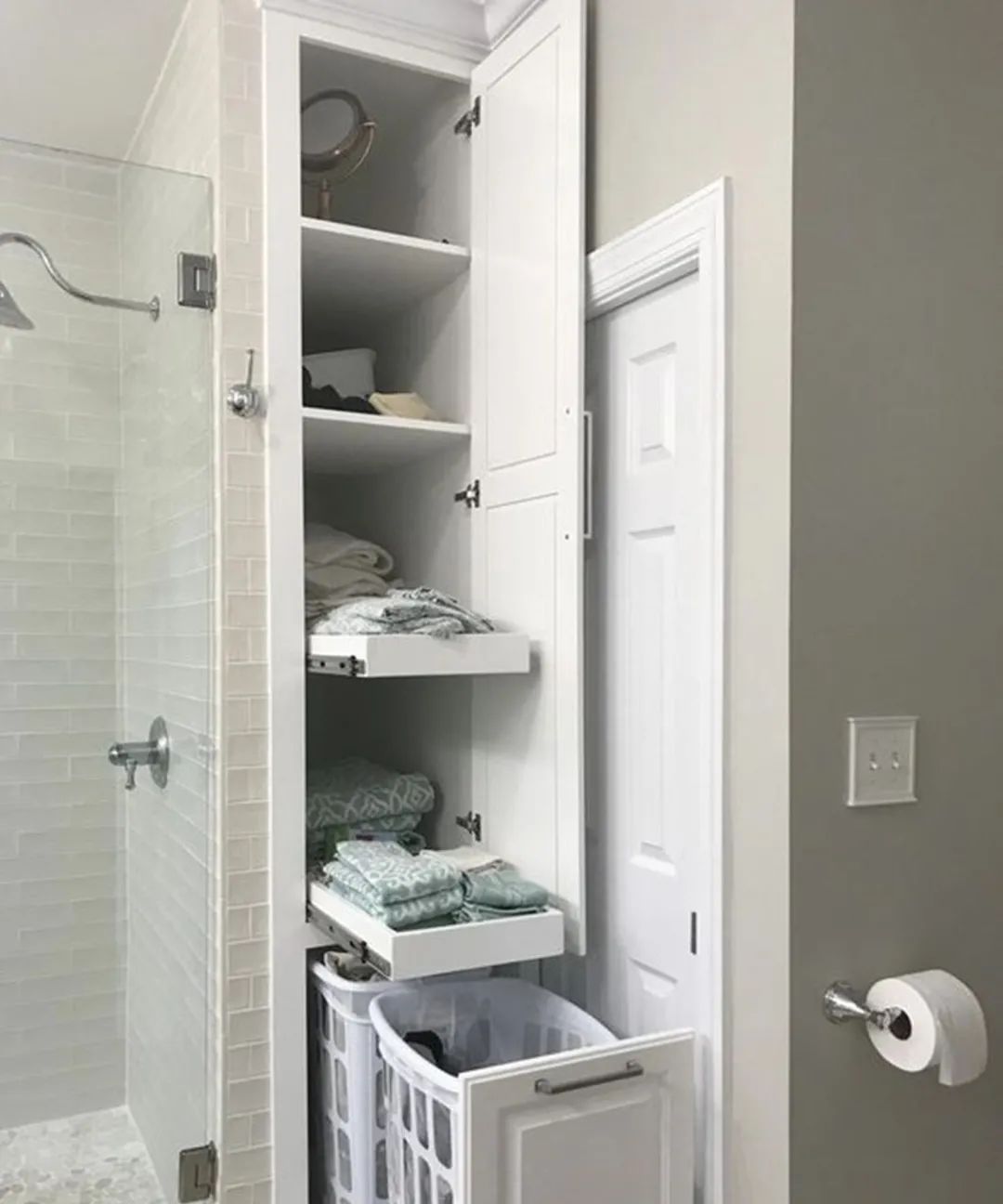 装法其实很简单,就是在淋浴房一边砌堵隔断墙,然后空出40公分,这时我们就可以选择在这里打上一排柜子了,平时一些毛巾、睡衣、甚至脏衣篓啥的统统都可以藏在这里,卫生间收纳多1㎡,而且拿取也方便。