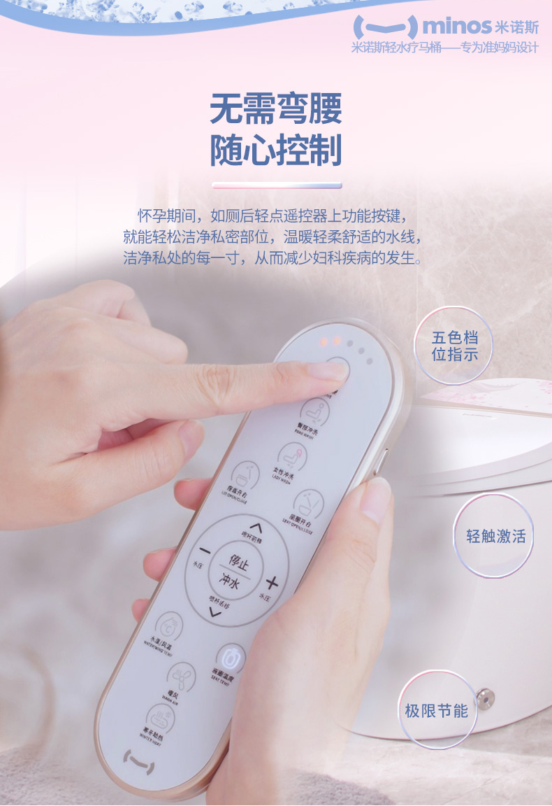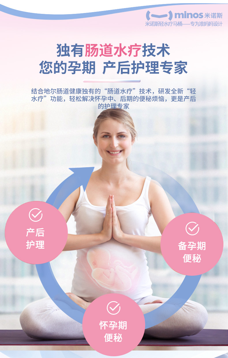 作为一款专为准妈妈设计的米诺斯“轻水疗”马桶在地尔健康独有的“肠道水疗”技术的基础上,创新研发出“轻水疗”功能,可以通过温水冲洗舒缓肛门肌肉和神经,并润入肠道末端,从而帮助软化大便,方便排出。