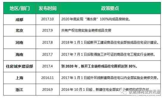 在2017年,成都、海南、上海等地陆续颁布了相关政策,以后住宅也将按照成品住宅建设。