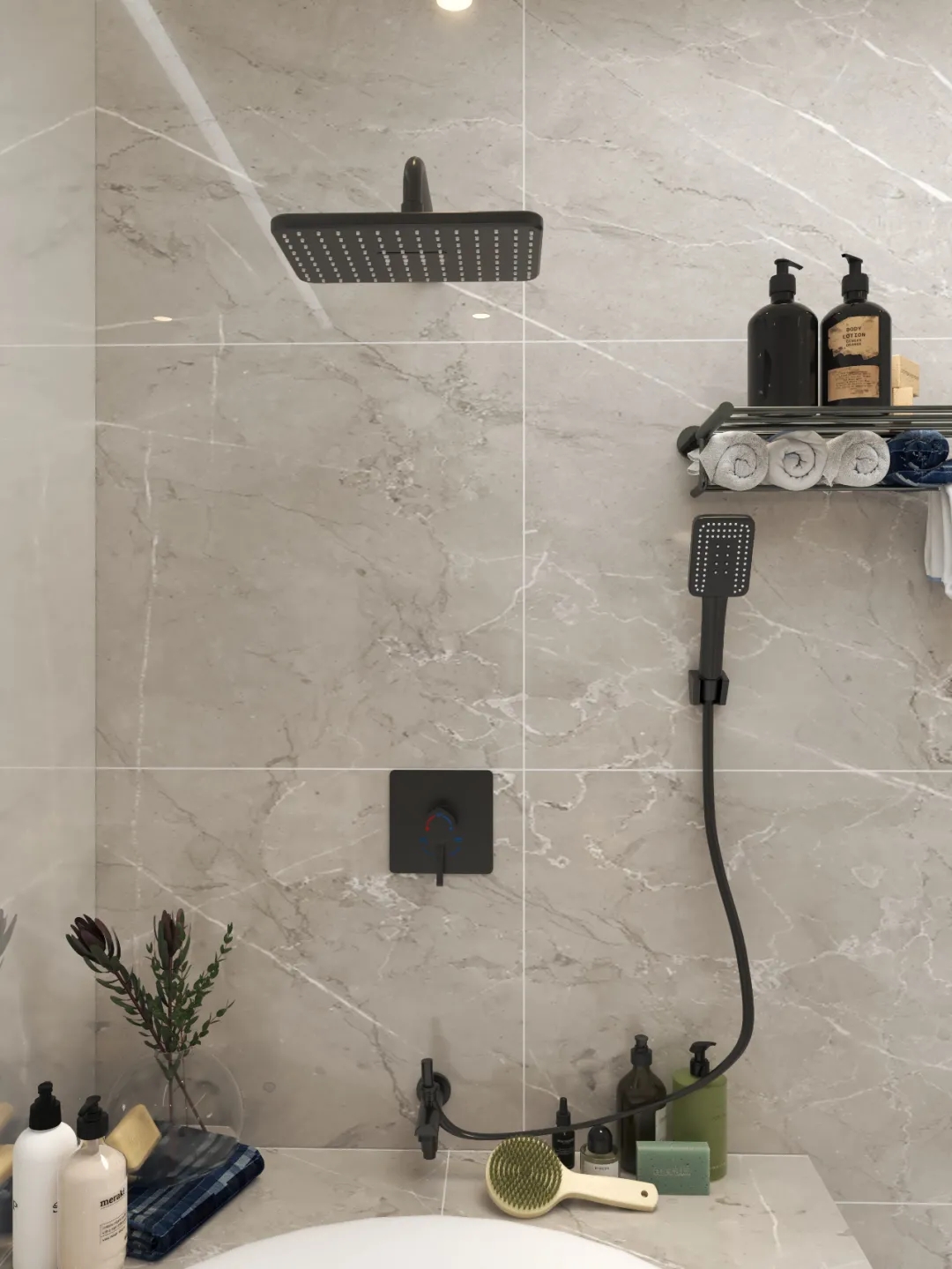 入墙式花洒设计,埋在墙内的水管取代了传统的明装顶喷支架和软管。进一步简化了淋浴系统。外观简洁大方,提升浴室整体颜值,让小浴室更加简洁宽敞,让大浴室更加高级奢华。