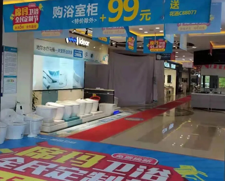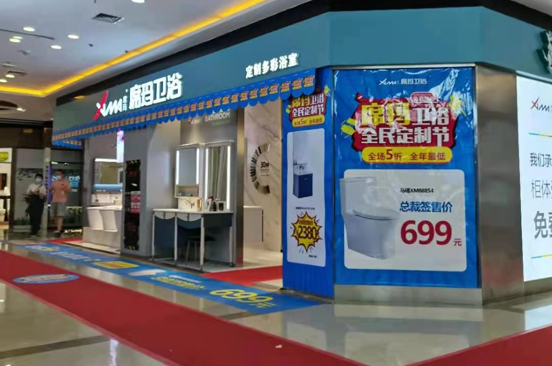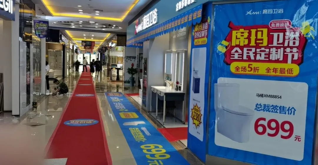 期间,席玛卫浴位于大连市甘井子区华南家居大世界的专卖店,打出了“全场5折,全年最低”的标语,不仅折扣喜人,还推出多款特价产品,如2380元的浴室柜、699元的XM88854马桶等。