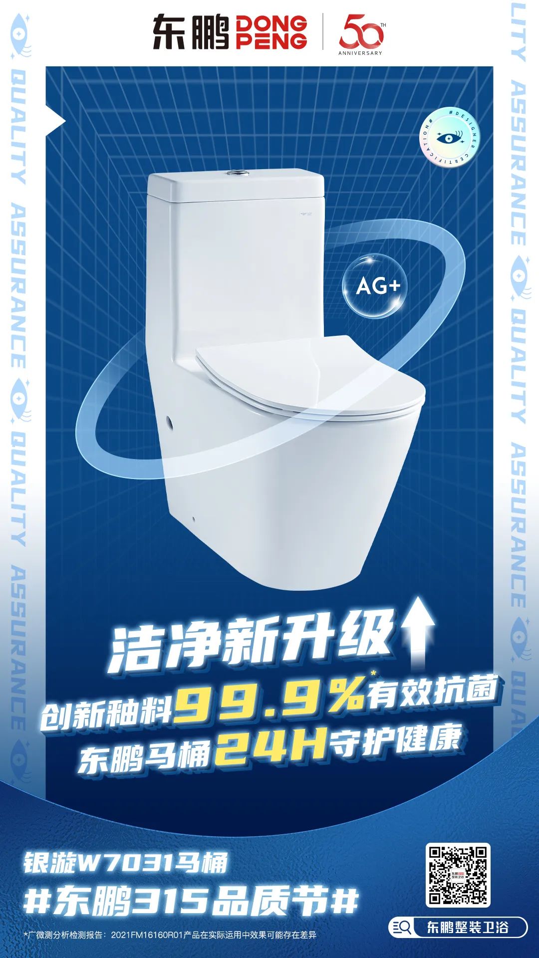 银漩W7031普通马桶采用东鹏独创晶银釉,在陶瓷体釉料中加入抗菌银离子,抗菌率高达99.9%,有效抑制细菌滋生,如厕体验感瞬间提升了N个level。