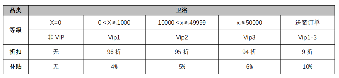 3、VIP用户:凡在鲁班到家平台充值1000元成为VIP1的用户,即可享受卫浴96折优惠;凡在鲁班到家平台充值10000元-49999元之间,成为VIP2的用户,即可享受卫浴95折优惠;凡在鲁班到家平台充值50000元及以上,成为VIP3的用户,即可享受卫浴94折优惠;卫浴送装订单9折优惠。