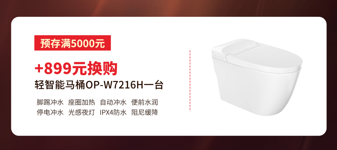 欧派轻智能马桶OP-W7216H轻松进阶优越生活习惯,创新卫浴新风尚。拥有座圈加热、光感夜灯、便前水润、阻尼缓降等功能;同时还有自动冲水、脚踢冲水等冲水功能。活动期间,预存满5000元,+899元即可抢购轻智能马桶OP-W7216H一台,从此轻松享受智能生活场景~