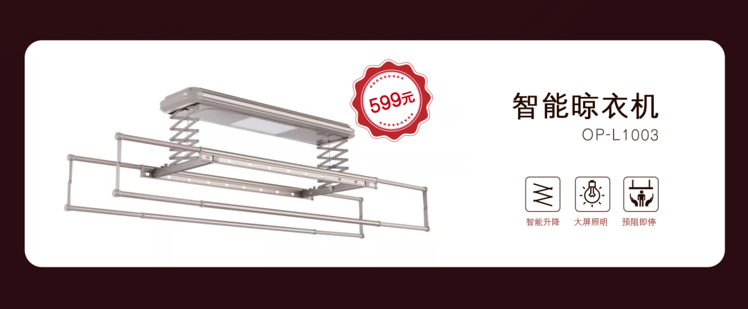 晾衣杆太高,不方便晾衣晒被?梅雨天气,衣服经常晾不干有异味?欧派卫浴智能晾衣机OP-L1003无线遥控,自由升降,无需垫脚或取晾衣杆,全家都能轻松晾衣;遇阻即停,给予家人最贴心的保护。