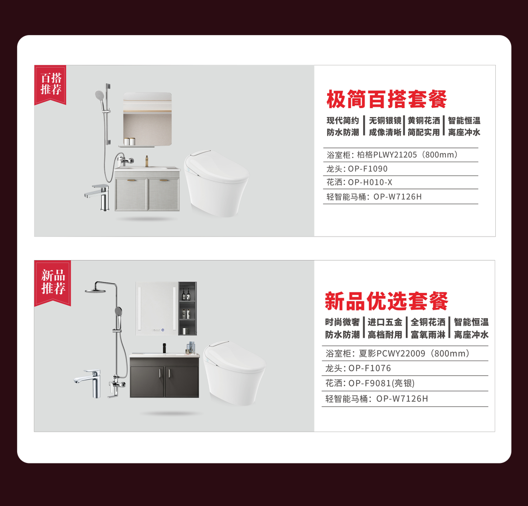 优惠不烧脑,品质带回家!四大明星精心搭配多款卫浴好物,诚意巨献超值优惠套餐,让你享受一站式购齐品质好物,一步焕新卫浴生活!大牌级别品质,冰点价出售,一条龙服务全配齐,你值得拥有!