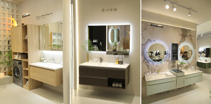 在今年的上海国际厨卫展期间,金顿卫浴将这一品牌文化理念融入展厅设计中,基于高品质浴室柜新品,融合时尚流行元素,通过多元化沉浸式空间场景以及现场内容文案,传递品牌文化内涵及其人文温度。