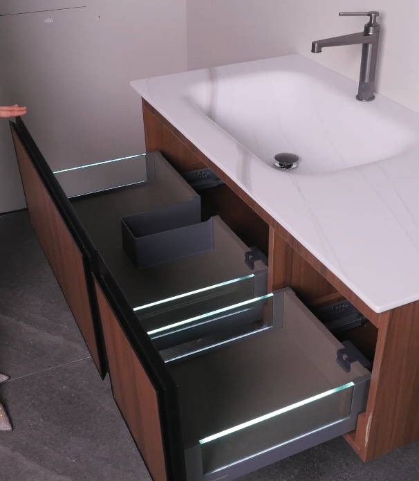 为了方便取用和整理,这款浴室柜采用分区收纳,台面留出宽敞的空间,摆放洗面奶、牙刷、牙膏等洗漱物品,伸手就能拿到,非常贴心。柜体采用1抽屉+1侧柜的设计,搭配多功能收纳盒使用,可以更好地分类整理各种小物品,内置感应灯光,氛围感满满,还能补充照明,让内部空间更加一目了然,便捷拿取。