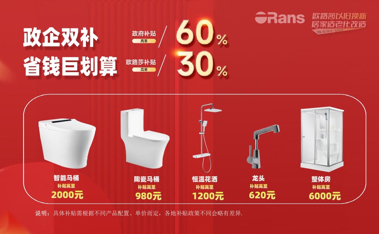 为了让更多家庭享受到这份关爱,认真贯彻落实党中央、国务院关于消费品以旧换新工作决策部署,精心策划,高效执行,重点支持旧房装修、厨卫等局部改造、居家适老化改造,欧路莎卫浴积极响应,推出了前所未有的双重补贴政策!政府补贴高达60%,叠加欧路莎补贴可高至30%,这意味着只需要平时1/3的预算,就能享受到全面的居家适老化改造服务,真正实现了物美价廉,让爱无负担。