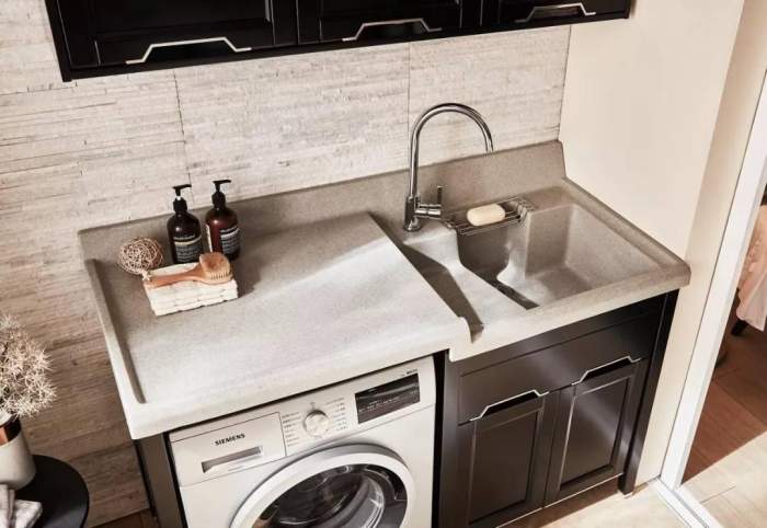尚高卡尔洗衣柜SW1400-7HG将洗衣机嵌入洗衣台的下方,黑色的柜体搭配灰色的台面,极具质感,高低盆的设计,也很有人性化,搭配着强大的储物空间,洗涤用品都能完美收纳。
