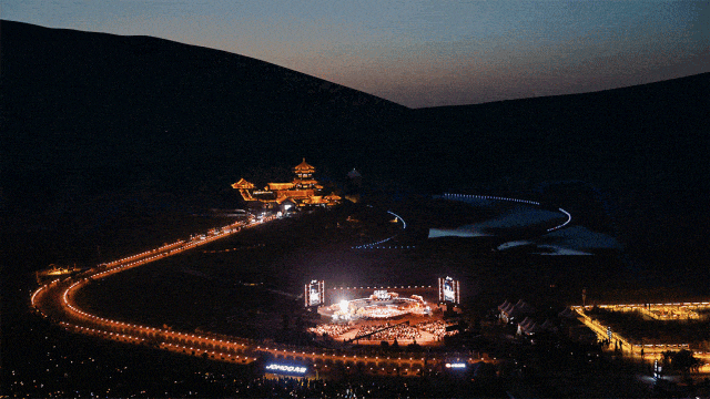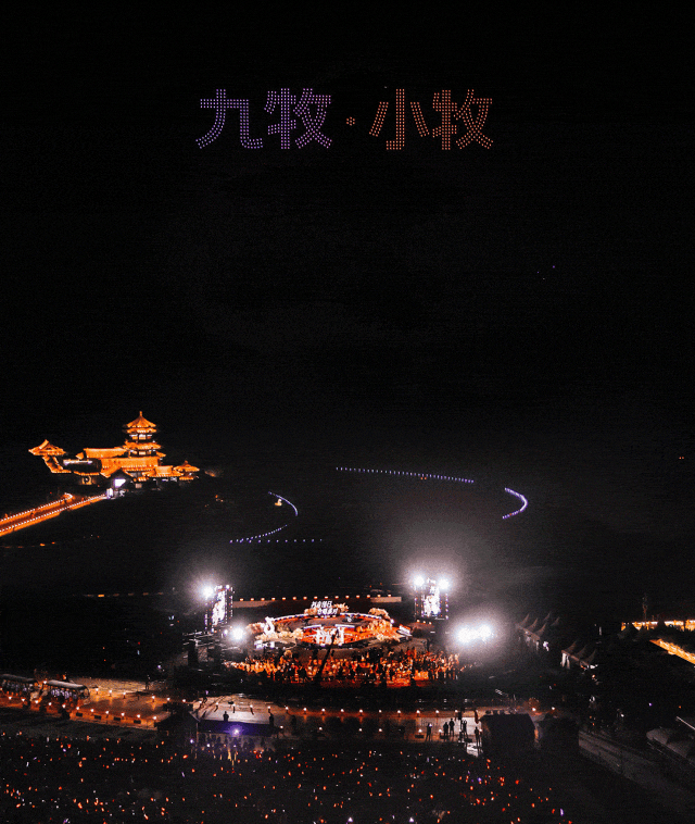 现场,随着上千架无人机在夜空中划出绚烂轨迹,一幅幅绝美景象在夜空中呈现,祝福来自五湖四海的人们中秋节快乐。特别是当无人机在夜空整齐排列出“九牧·小牧”文字时,瞬间就把音乐季的氛围推向最高潮,整片沙海仿佛变成了一座光影交织、如梦如幻的星空剧场,让千年丝路的沧海故事和现代科技在每个游客心中激荡徘徊。