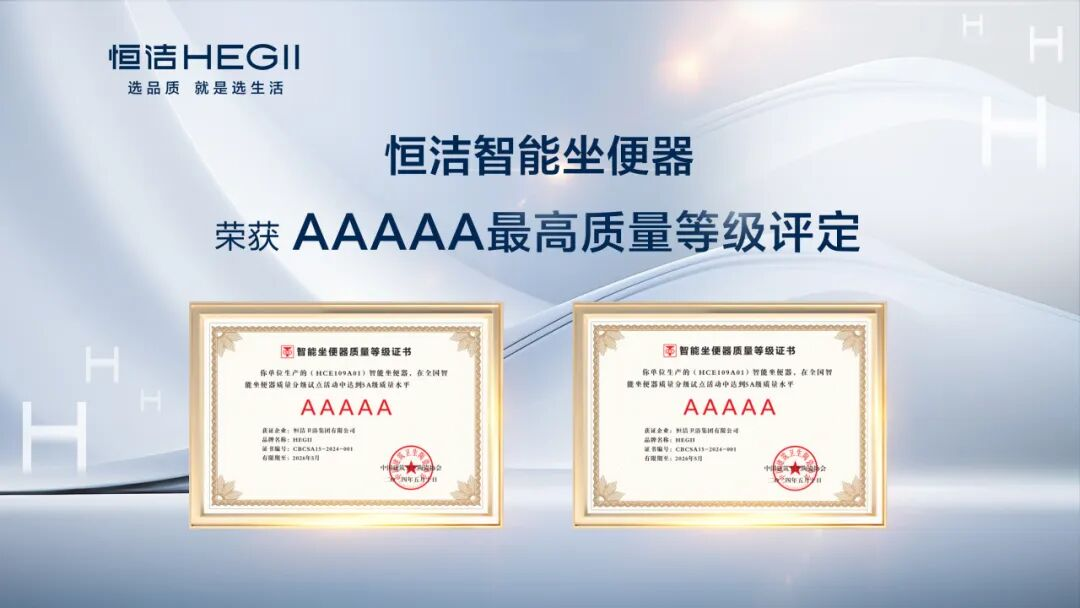 从标准制定到技术创新,恒洁以行动诠释行业领军者的实力和担当。在中国建筑卫生陶瓷协会组织的质量等级评定中,恒洁智能坐便器荣获行业最高 AAAAA级质量等级,表明其在功能性、舒适性与耐用性等核心指标上已达到国际领先水平。此前,恒洁产品已通过国家3C认证并获得“水效标识001号”。
